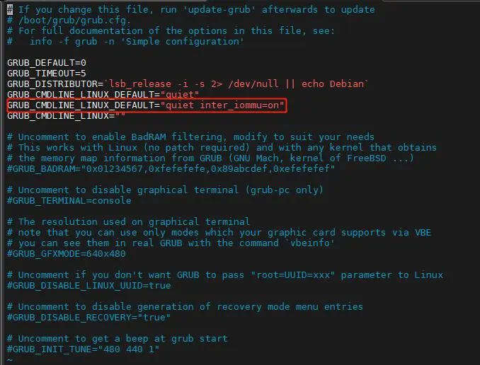 将GRUB_CMDLINE_LINUX_DEFAULT="inter_iommu=on"行修改为如下: